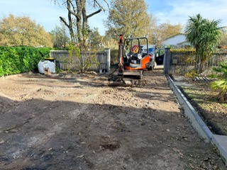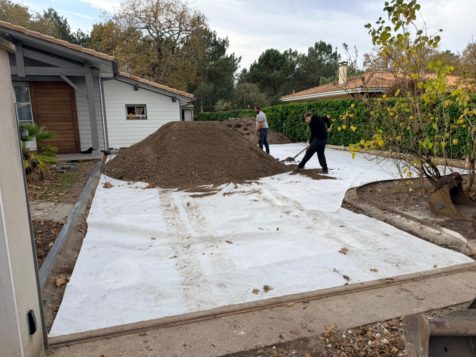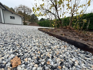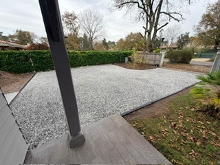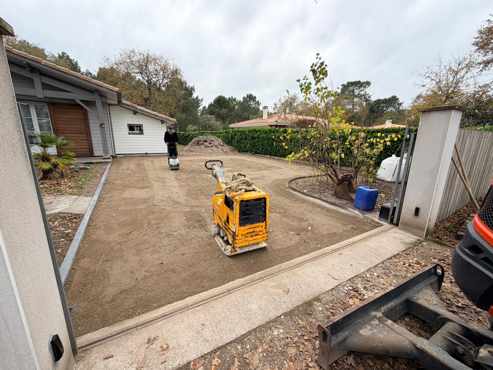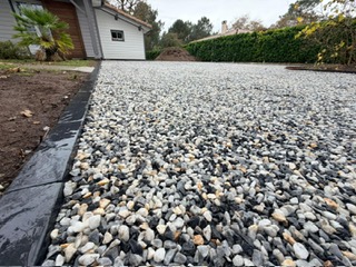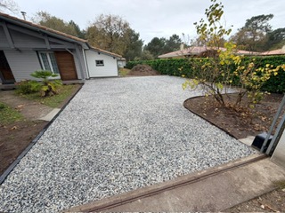 Aménagement complet d’une zone de stationnement en gravillon, depuis le terrain brut jusqu’au résultat final, pratique et esthétique.